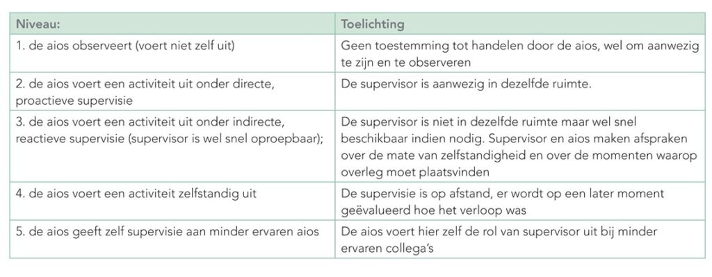 Naarmate je meer ervaring hebt opgedaan en dus bekwamer bent, heb je minder supervisie nodig. Er worden 5 supervisieniveaus onderscheiden: